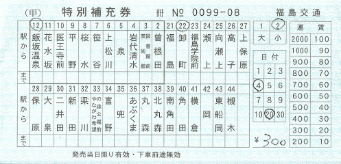 飯坂温泉~卸町の乗車券です。特別補充券というものが使われ、